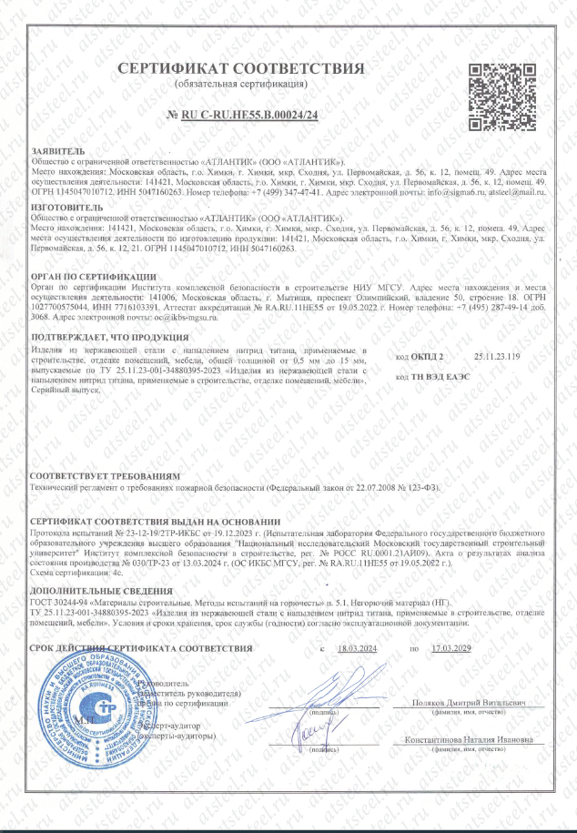 На листы и изделия есть сертификат обязательной сертификации, группа горючести НГ.
